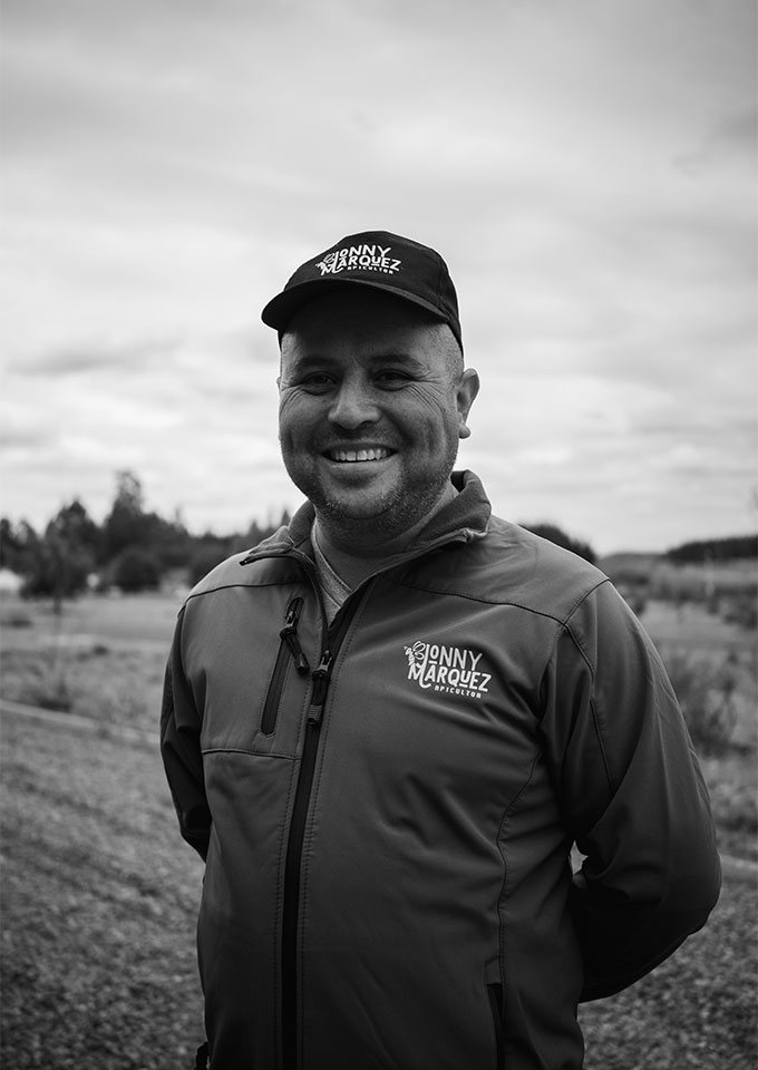«En bosques certificados de la empresa CMPC, el apicultor Jonny Márquez, maneja parte de sus colmenas; cuya producción de miel logró certificarse por primera vez en Chile, respaldando con ello su trazabilidad y manejo apícola.