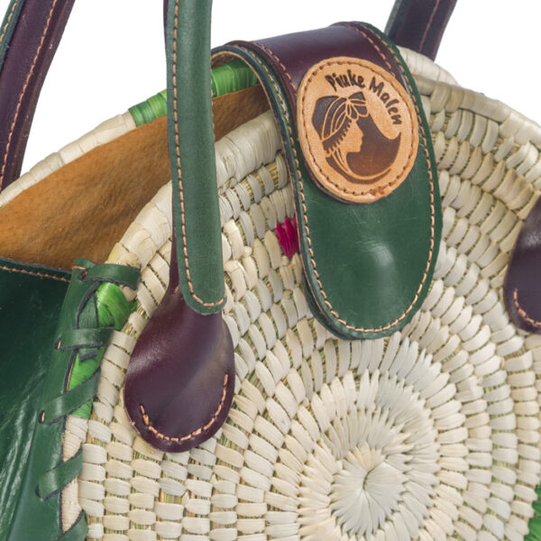 Cartera de ñocha con cuero teñido verde, con asa de cuero corta.