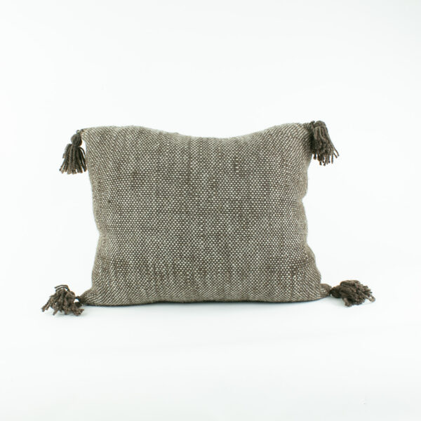 Cojín café de lana natural hecho en telar tradicional.