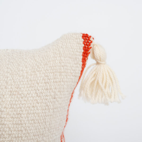 Cojín telar crudo con línea ladrillo 60 x 50 cm., tejido a mano por Griselda Cuevas, de la agrupación Kuifi Kimün.
