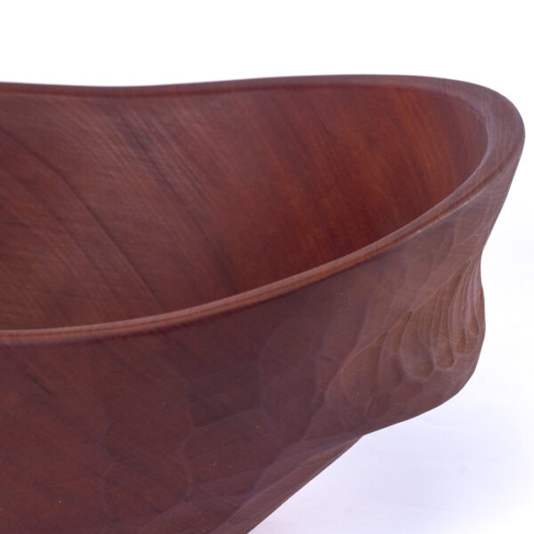 Fuente atravesada de madera nativa (raulí o lingue), tallada a mano por el artesano Héctor Bascuñán, de Villarrica (La Araucanía).