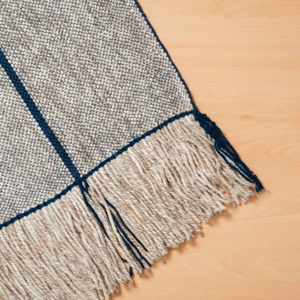 Piecera telar gris y azulino, tejida a mano por Sissy Avilés de la agrupación de mujeres Kuifi Kimün, que rescata la tradición mapuche con diseños contemporáneos.