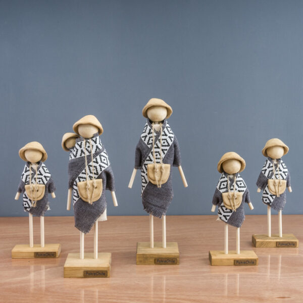 Figuras decorativas hechas a mano, con base de madera, cuerpo de palitos (pokis) y cabeza de cerámica. Su vestuario es característico de pueblos originarios y representan a la familia. ¡Arma la tuya!